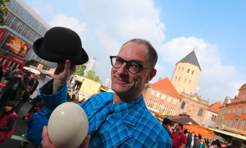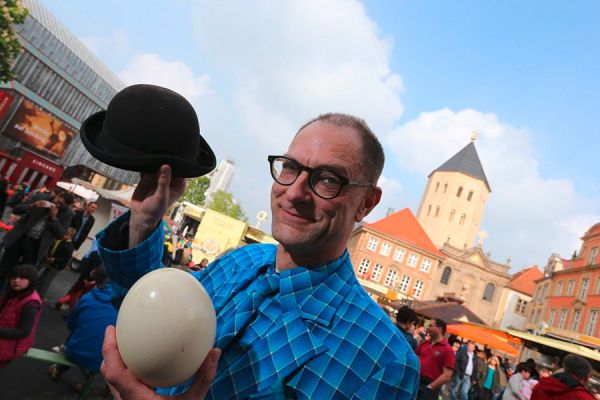 Mit feingliedrigem Fingerspitzengefühl und dem untrüglichen Blick fürs Modische verwandelt Andy Clapp die Straße in ein Feuerwerk lebendiger Situationskomik und absurder Gags, die die Menge magisch anzieht.